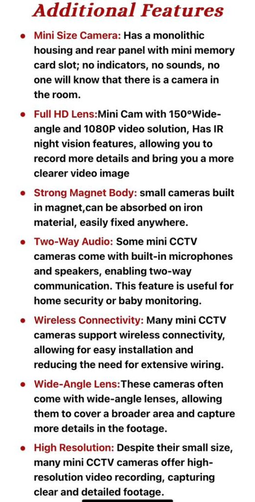 Discreet and portable, this mini spy camera is designed for covert surveillance. Its compact size (approx. 1-2 inches) and lightweight design allow for easy placement and concealment.